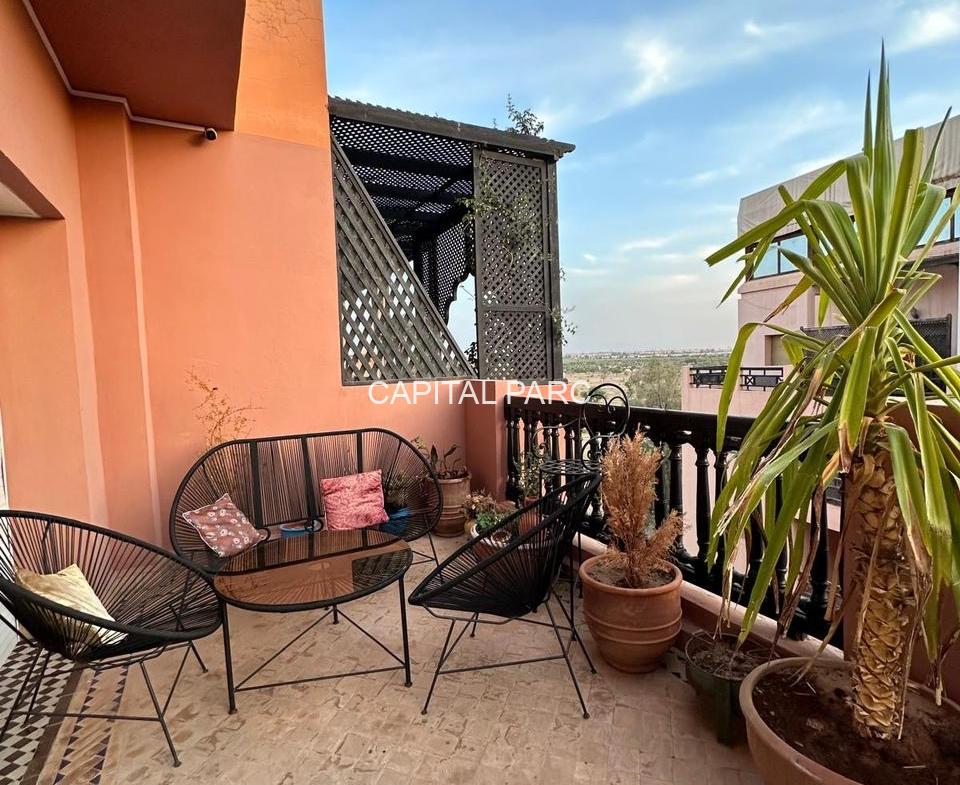 Bel appartement situé au 4eme étage d’une belle résistance a l’hivernage marrakech , 118 m avec 25 m de terrasse , 2 chambres , 2 salles de bain , cuisine équipée, place parking . Résidence avec ascenseur et piscine .
