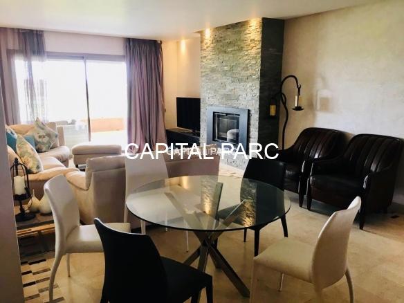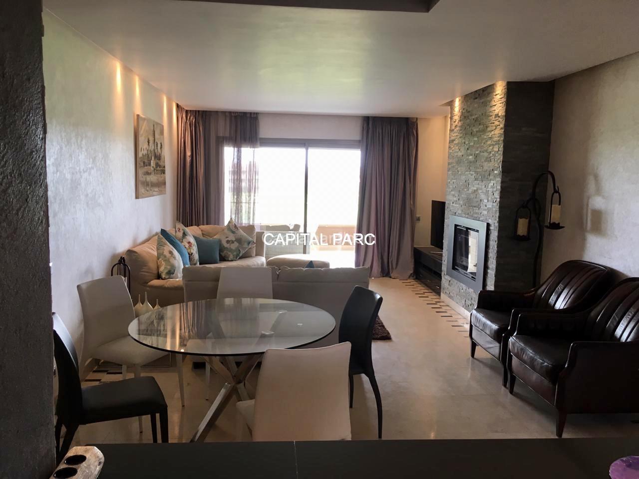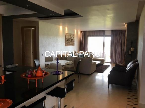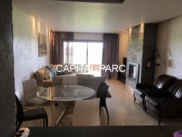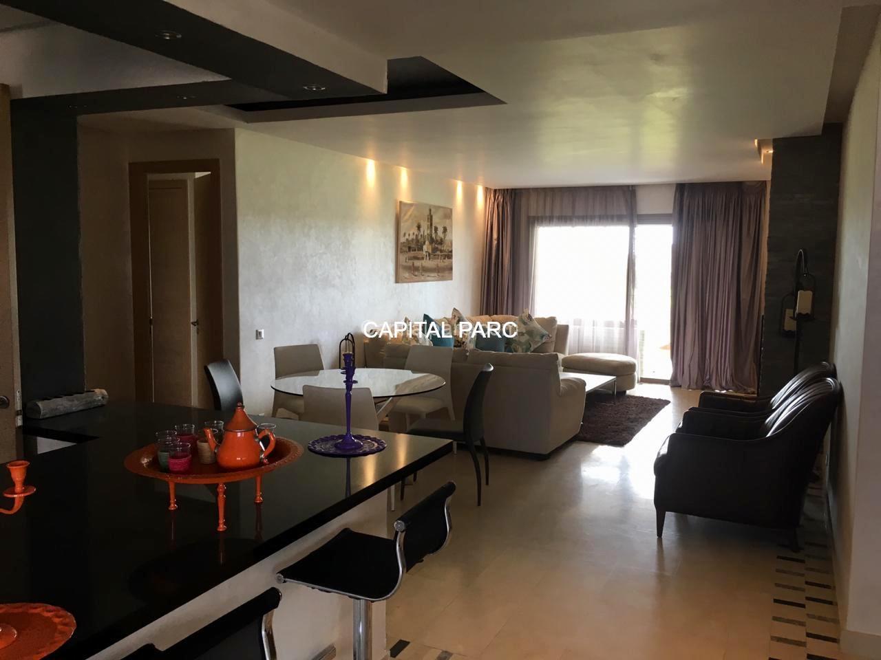 Bel appartement de 151 m, bien meublé , décoré avec goût , double salon , cuisine ouverte bien équipée , deux chambres dont une parentale avec sa salle de bain et toilette , belle terrasse avec vu sur le couché du soleil et le golf . Résidence avec un parcours de golf , une bonne maintenance des parties commune et le ne sécurité maintenue H24