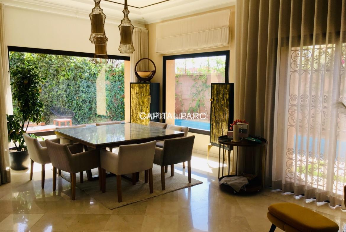 Villa de 475 m de terrain , deux niveaux ,R+1 , avec une terrasse accessible . Le rez-de-chaussée comprend , un grand salon marocain , un salon moderne , un coin cheminée , salle à manger , qui forme un seul espace ouvert à travers six baies vitrées avec vue sur la piscine et le jardin .