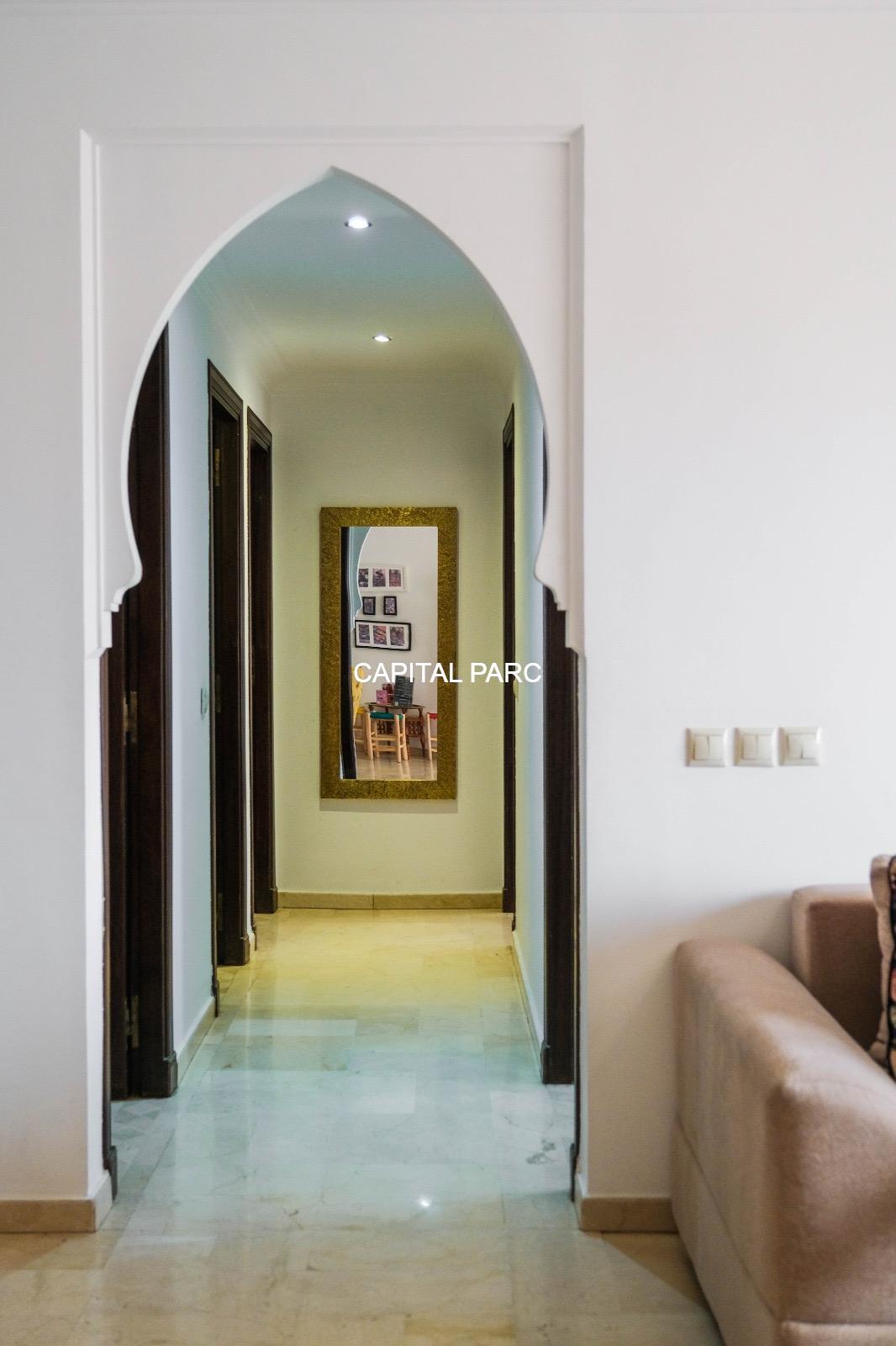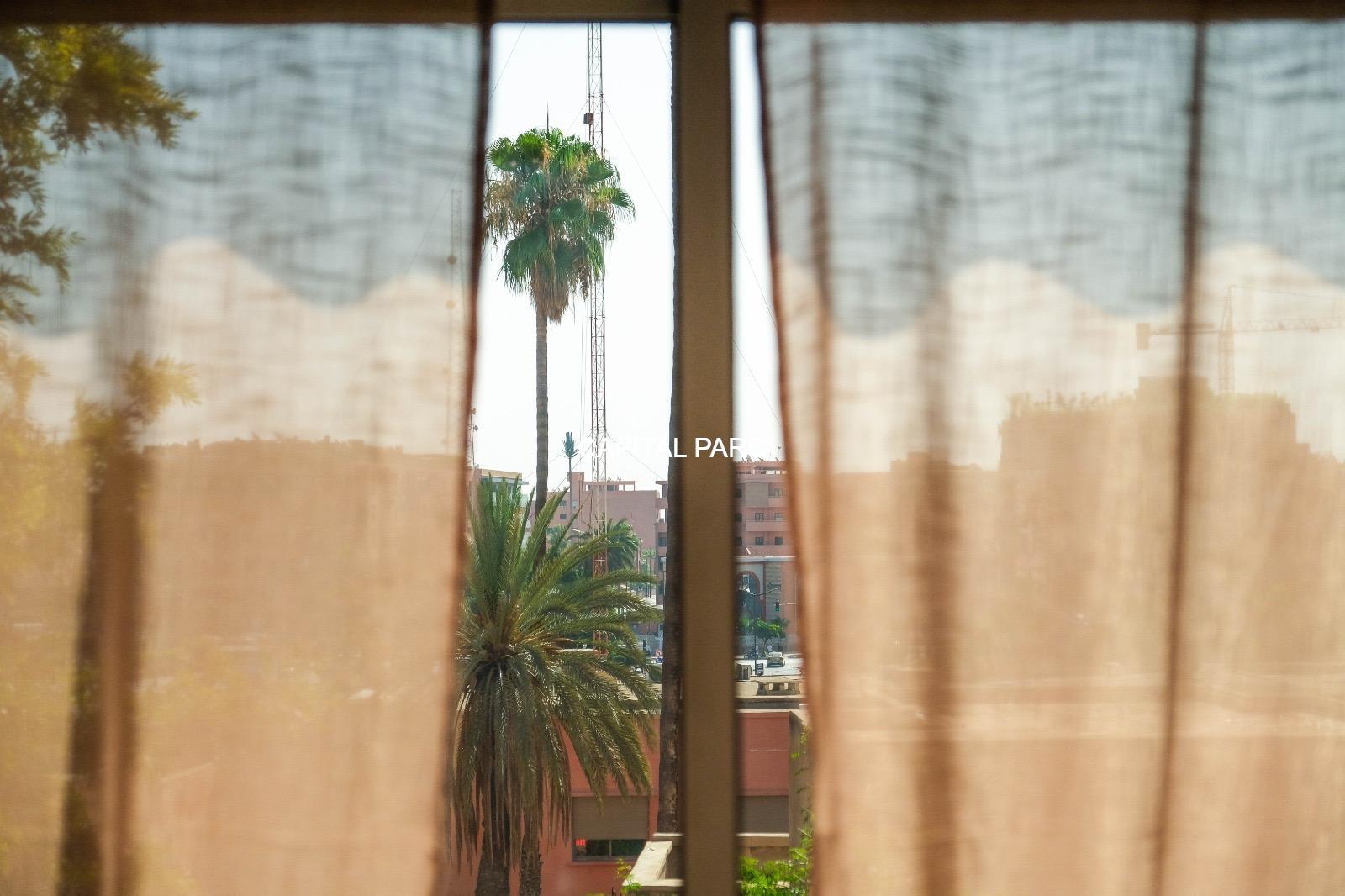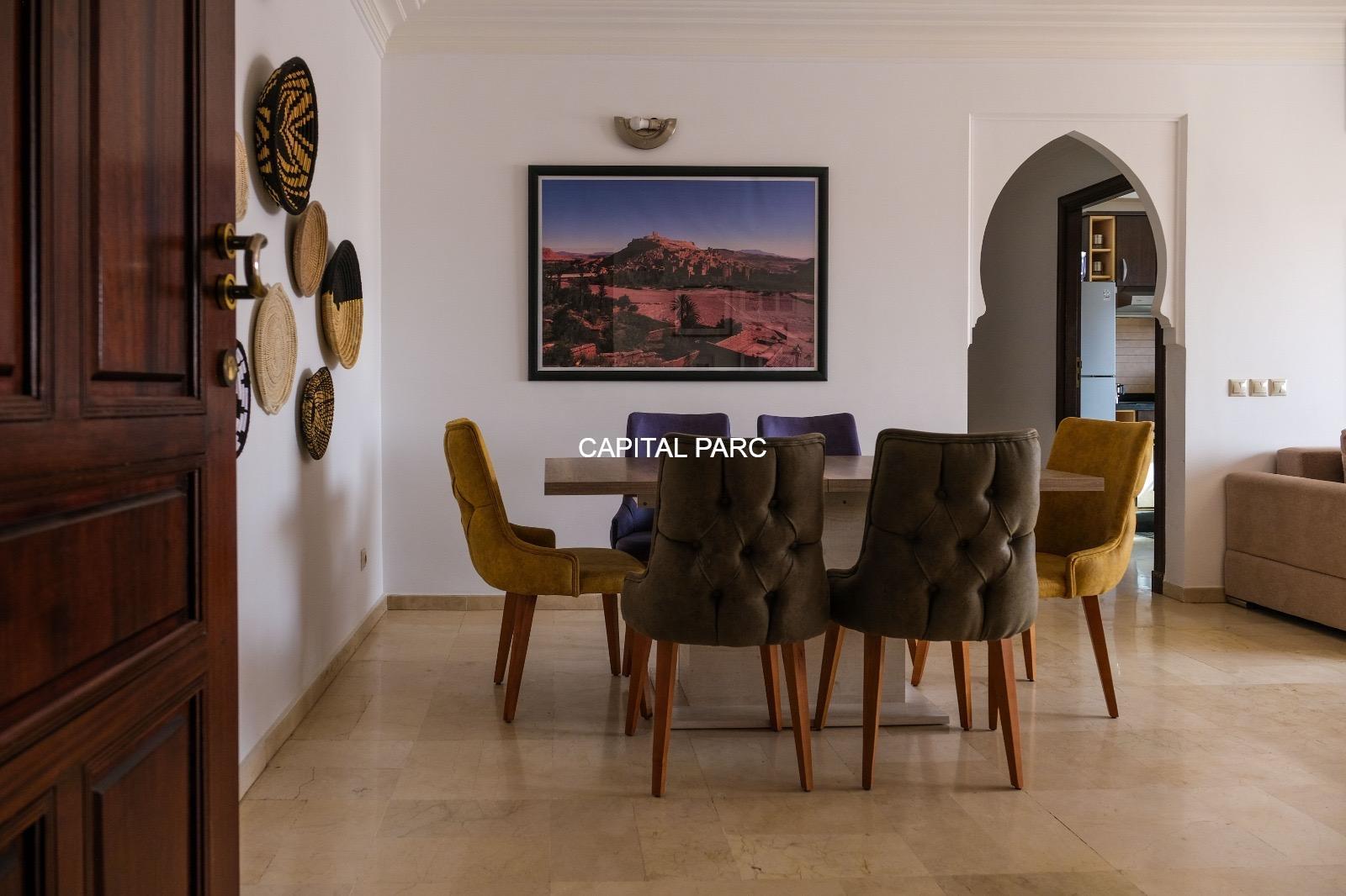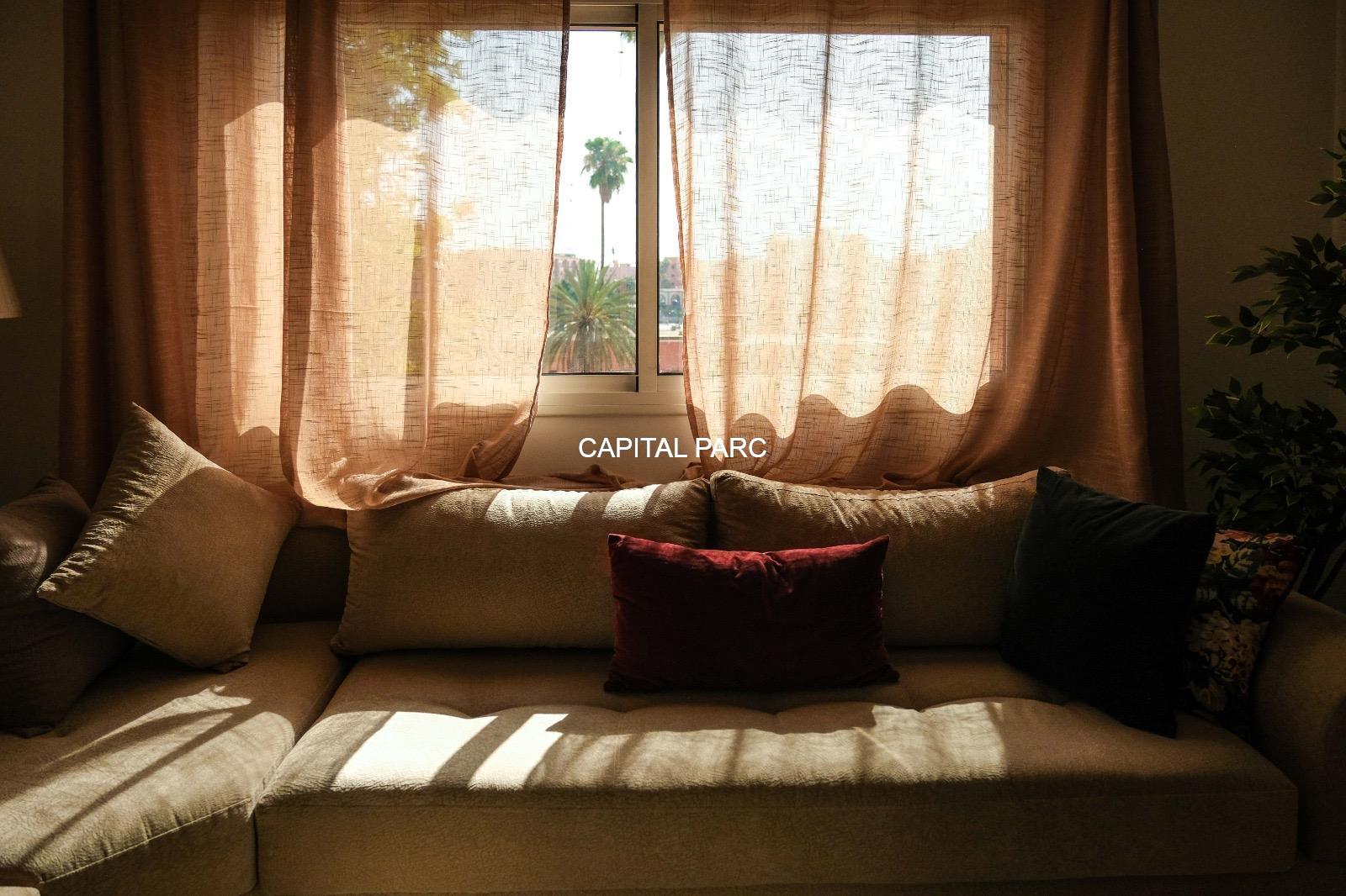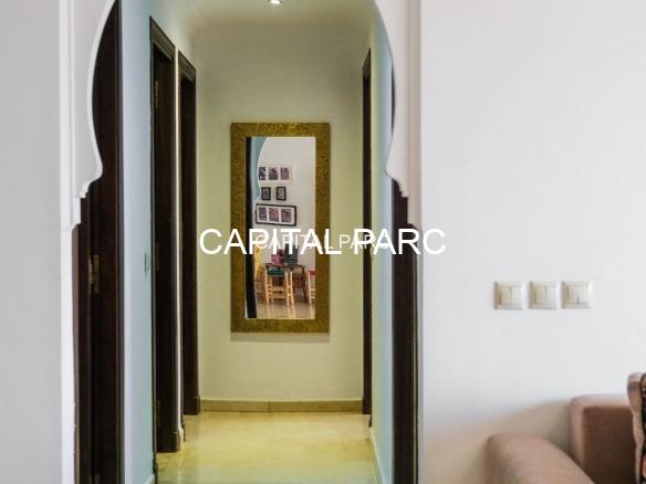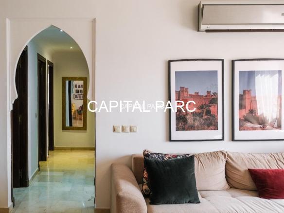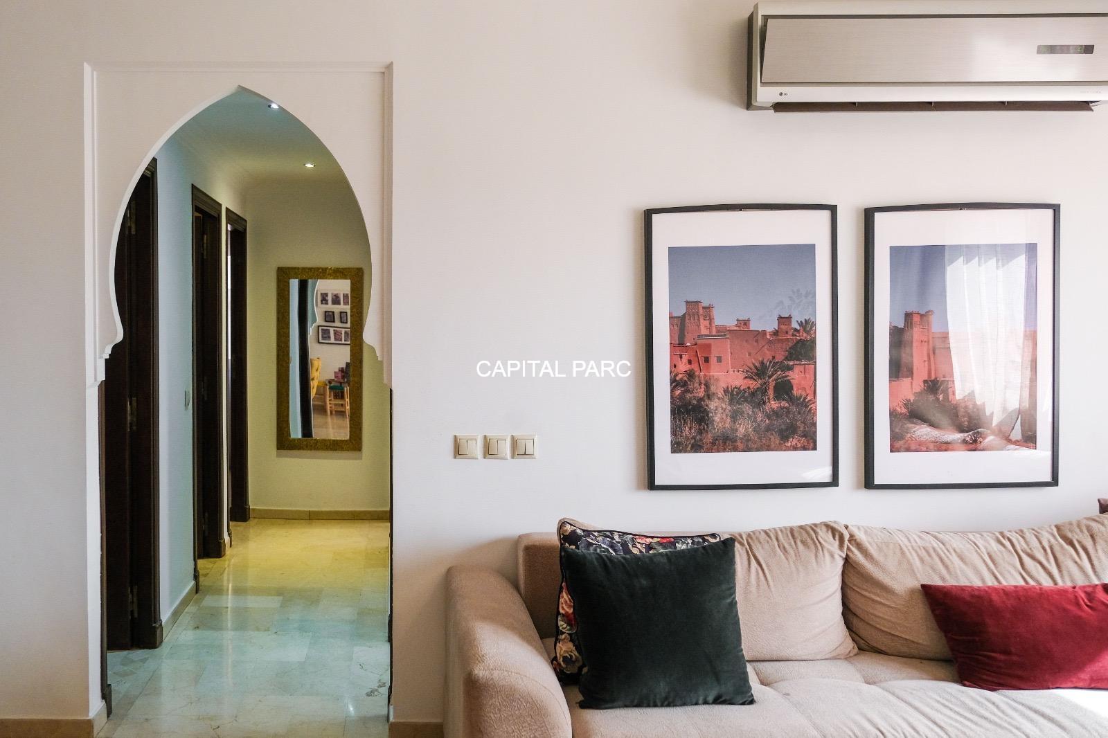 Ville : Marrakech , quartier : gueliz , étage : 3eme , superficie : 80 m . Bel appartement soigneusement meublé avec goût , situé au 3eme étage d’une belle résidence au coeur du quartier des affaires a gueliz . La résidence est située à seulement 2 minutes du café de la poste et Mcdonald. Quartier calme , voisinage de qualité, résidence avec ascenseur , surveillée H24 .