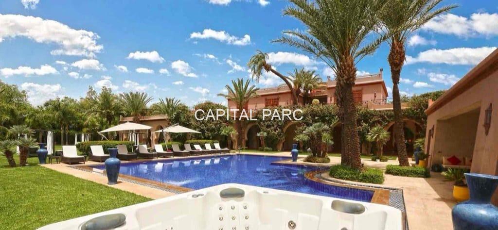 Sur un par arboré de 1,7 ha , palmiers , oliviers et d’autres essences d’arbres exotiques, le Batiment imposant aux allures majestueuses avec une architecture Arabo-mauresque, un véritable havre de paix . 1000 m de couvert , 5 suites , double salon , salle à manger , grande terrasse , hammam traditionnel, piscine chauffée et une équipée professionnelle mise à votre disposition pour rendre votre séjours inoubliable et agréables.