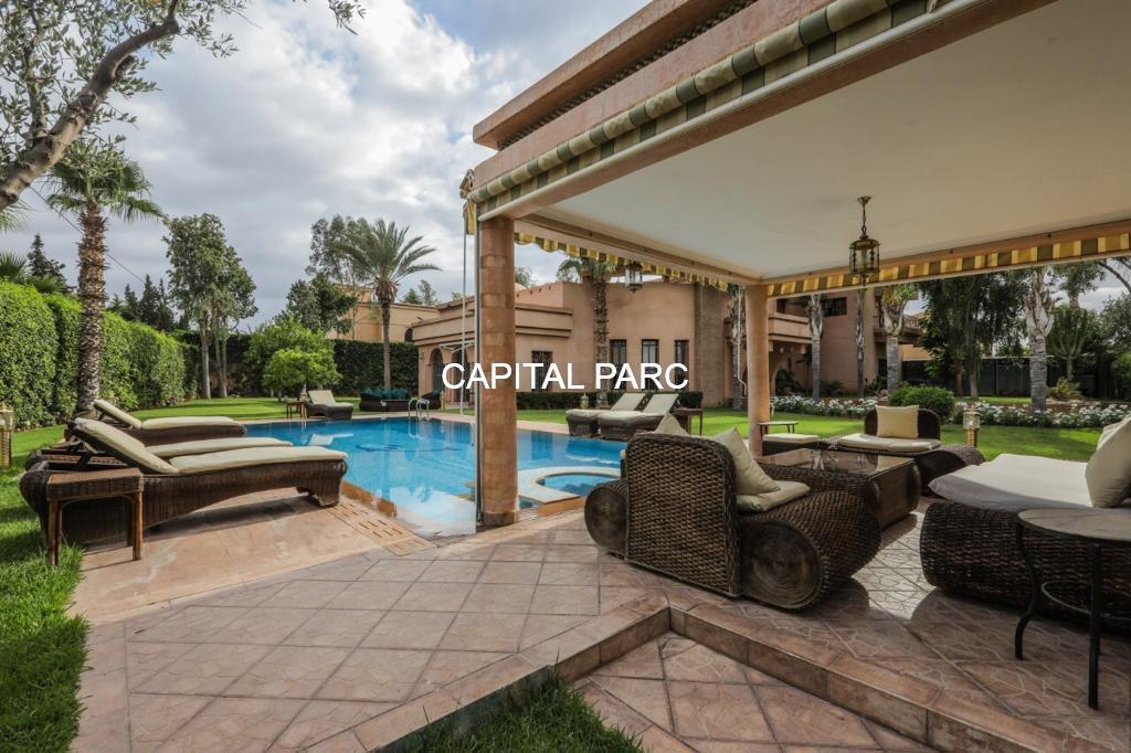 Climatisation centrale dans la réception qui est ouverte avec un grand salon marocain (équipée d’une coupole en bois) ainsi qu’un coin cheminé et trois autres salon européen et bien évidemment une salle à manger tout en bois. La réception est équipée de grande toilette avec leur dressing pour les invite. Les escaliers royaux font le lien entre la réception et l’étage ou se situe les chambres (appart une chambre d’ami qui est en bas et qui est aussi coller a un salon de tout les jours).