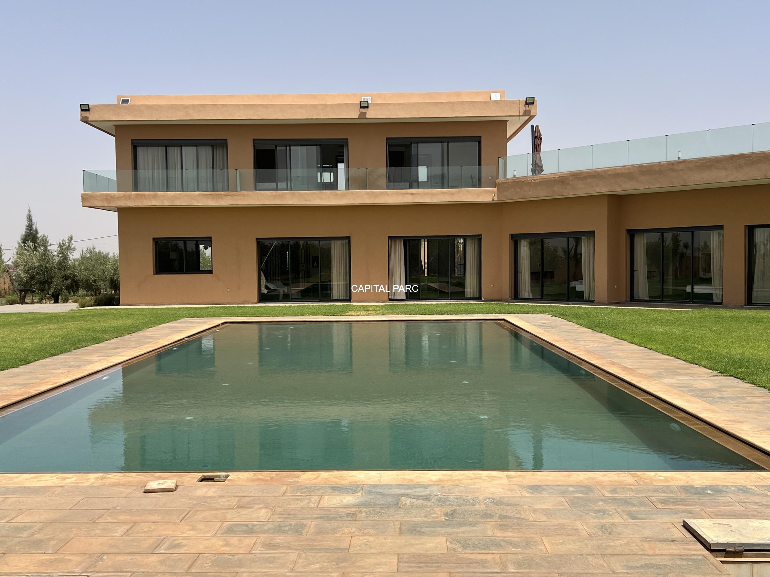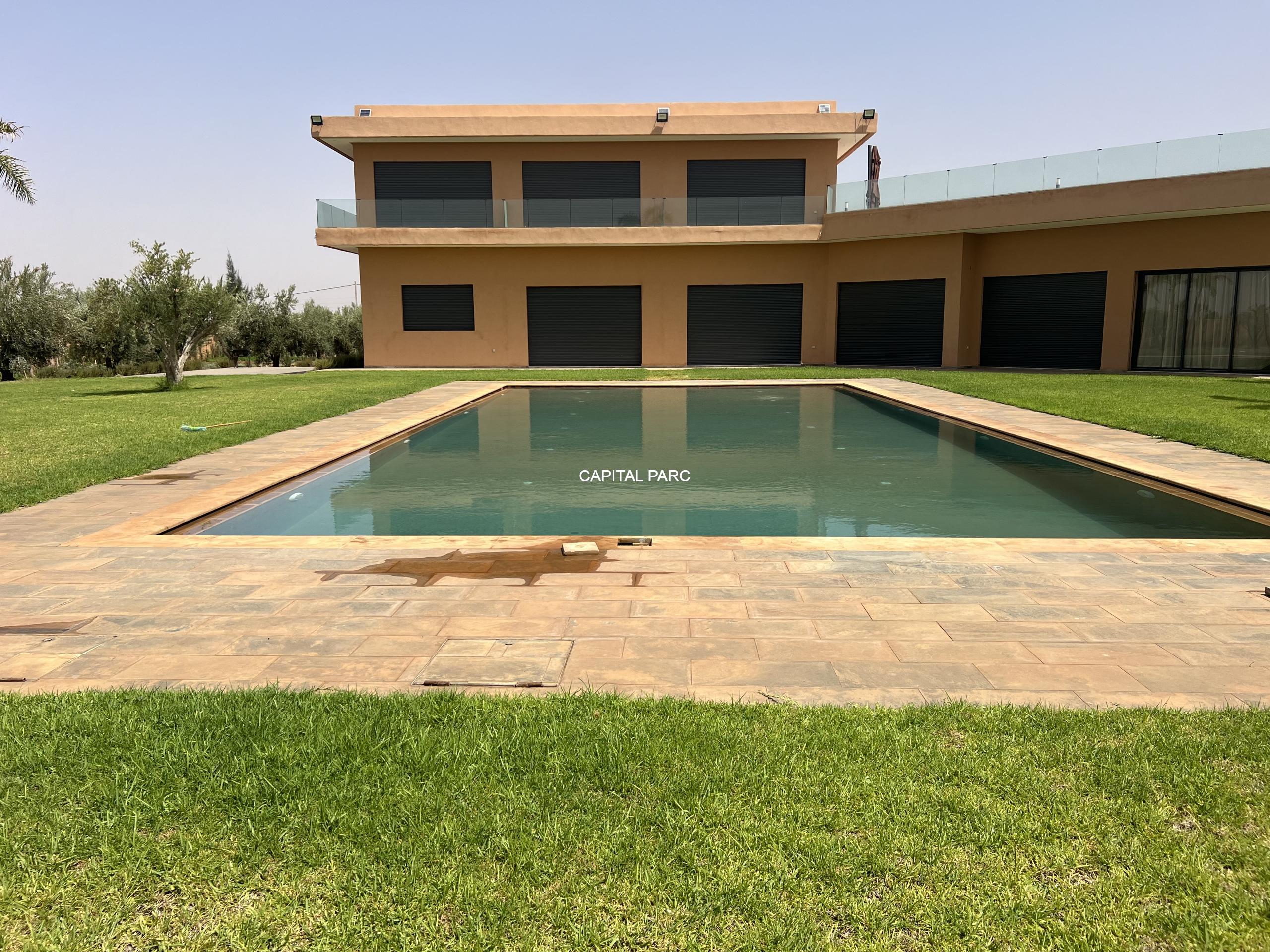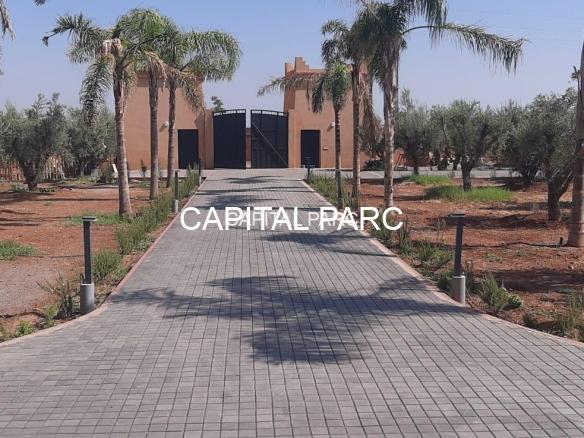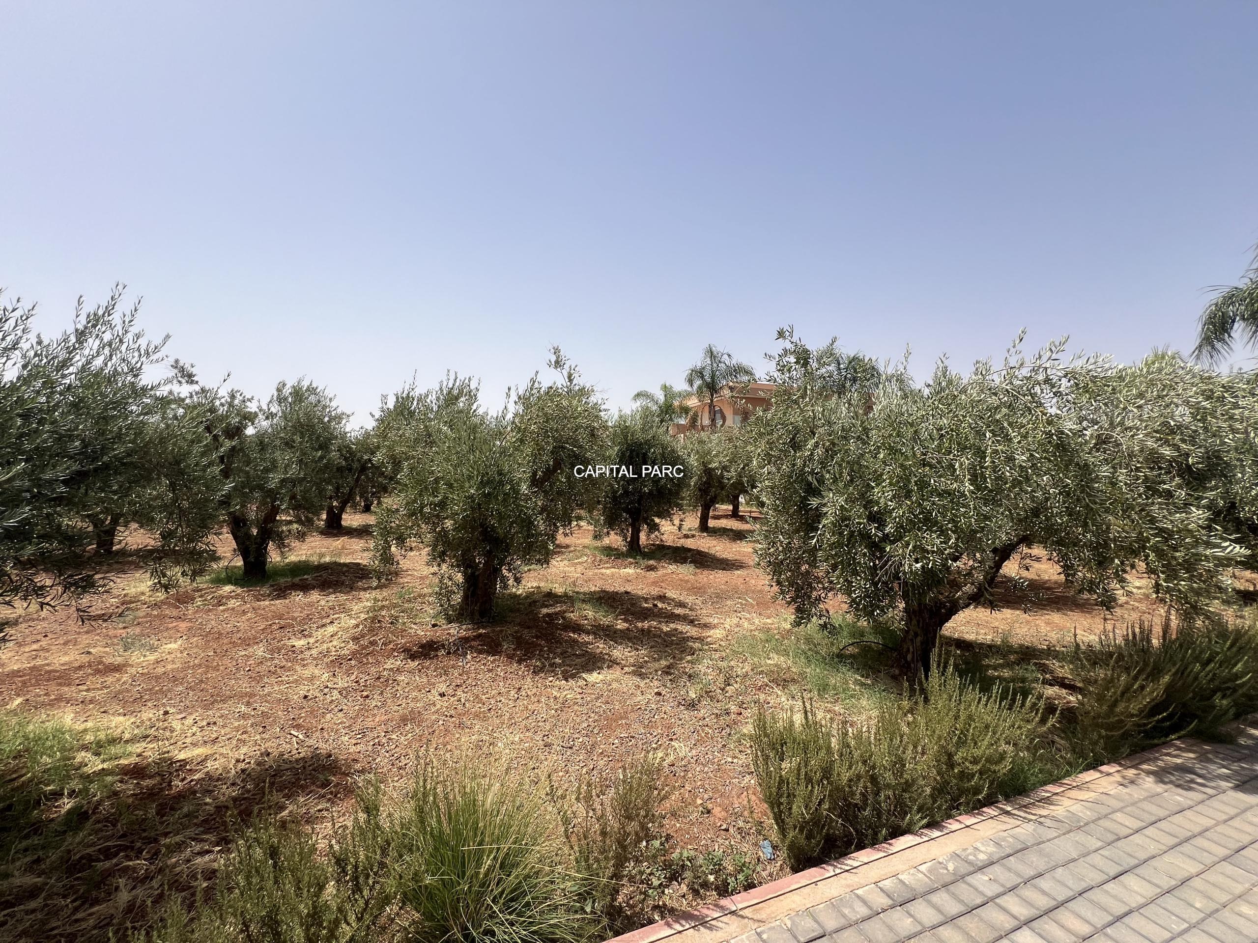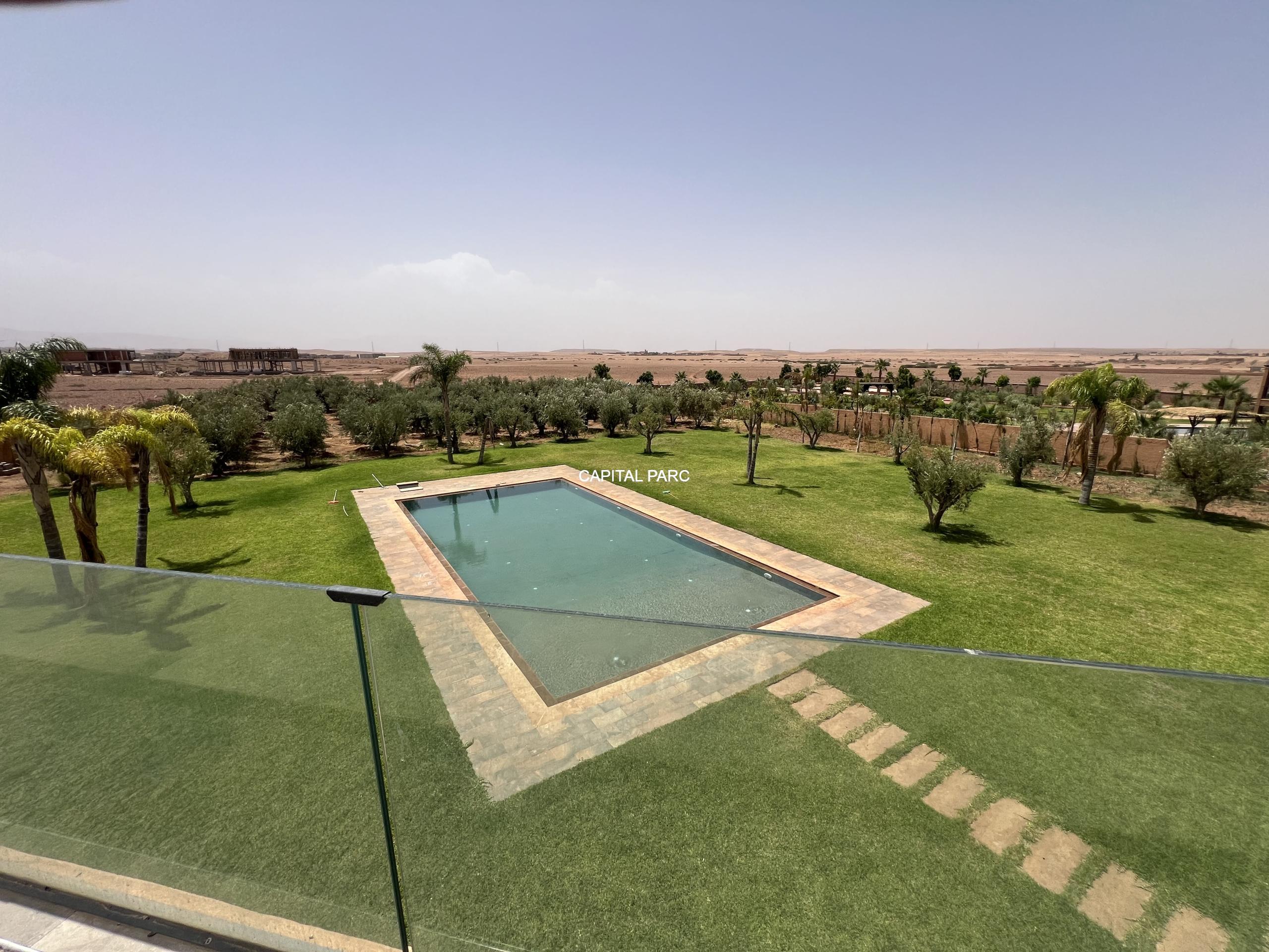 Situation : route barrage 25 minutes de marrakech , orientation : sud , superficie : 10 000 m , habitable 460 m , nombre de niveaux : 2 , nombres de suites : 6 , nombre de salon 2 , cheminée au salon , baie-vitrée partout , vue sur les montagnes, belle prestation, design art-deco , grande piscine à débordement, 17×8 m , 210 oliviers , local technique , puits , mir de clôture. Villa facilement accessible, 400 m de bonne piste . Voisinage de qualité.
