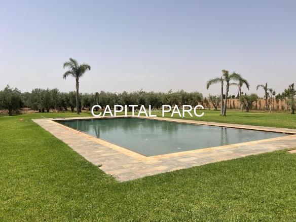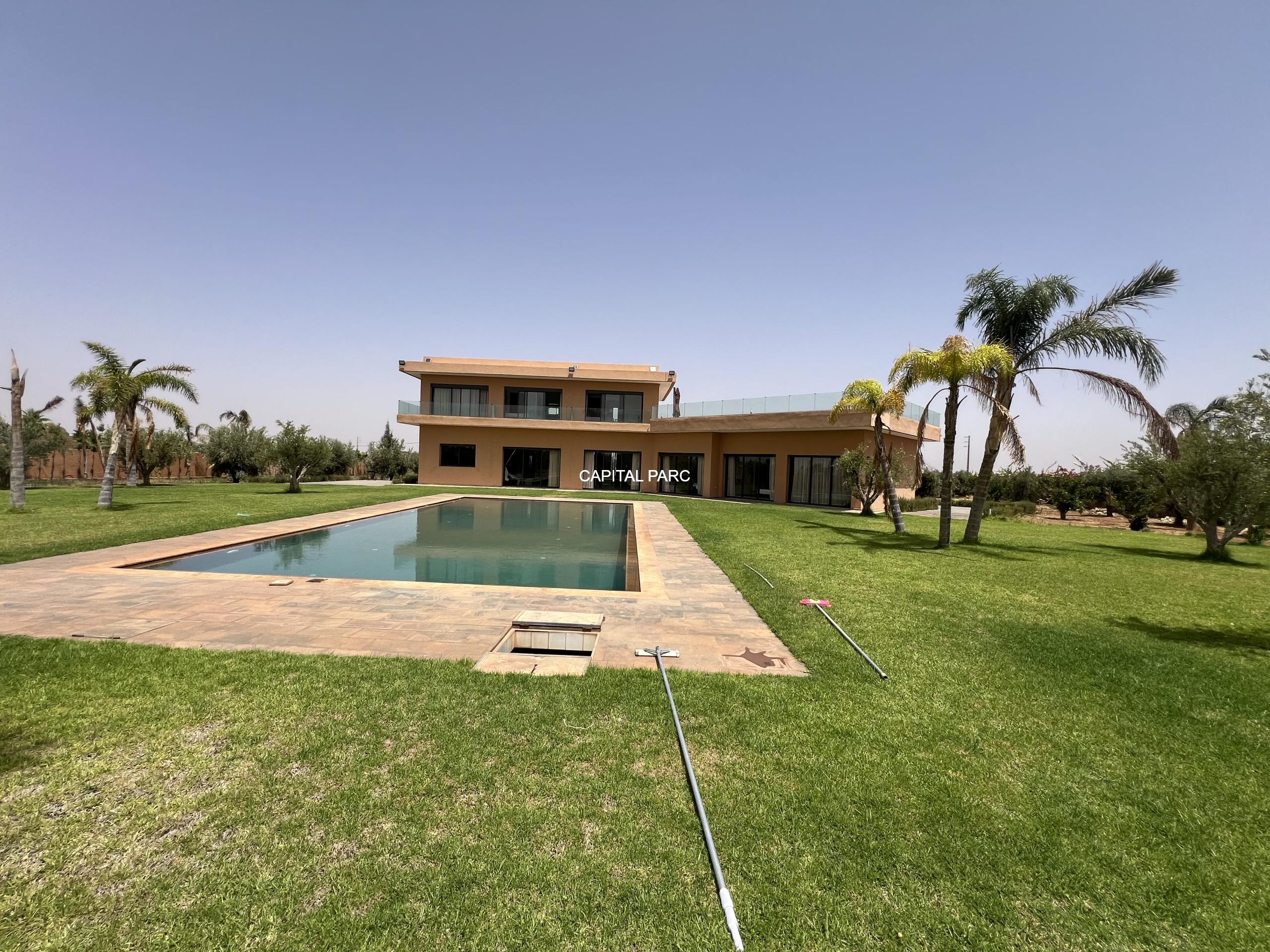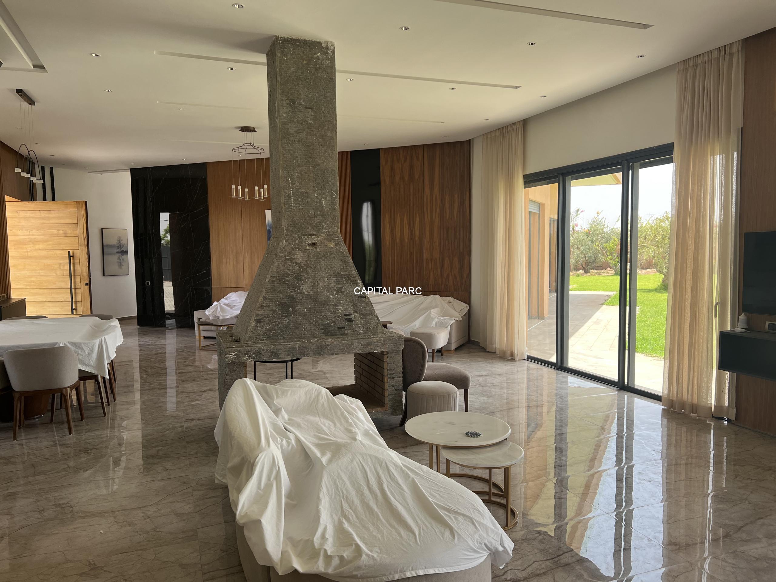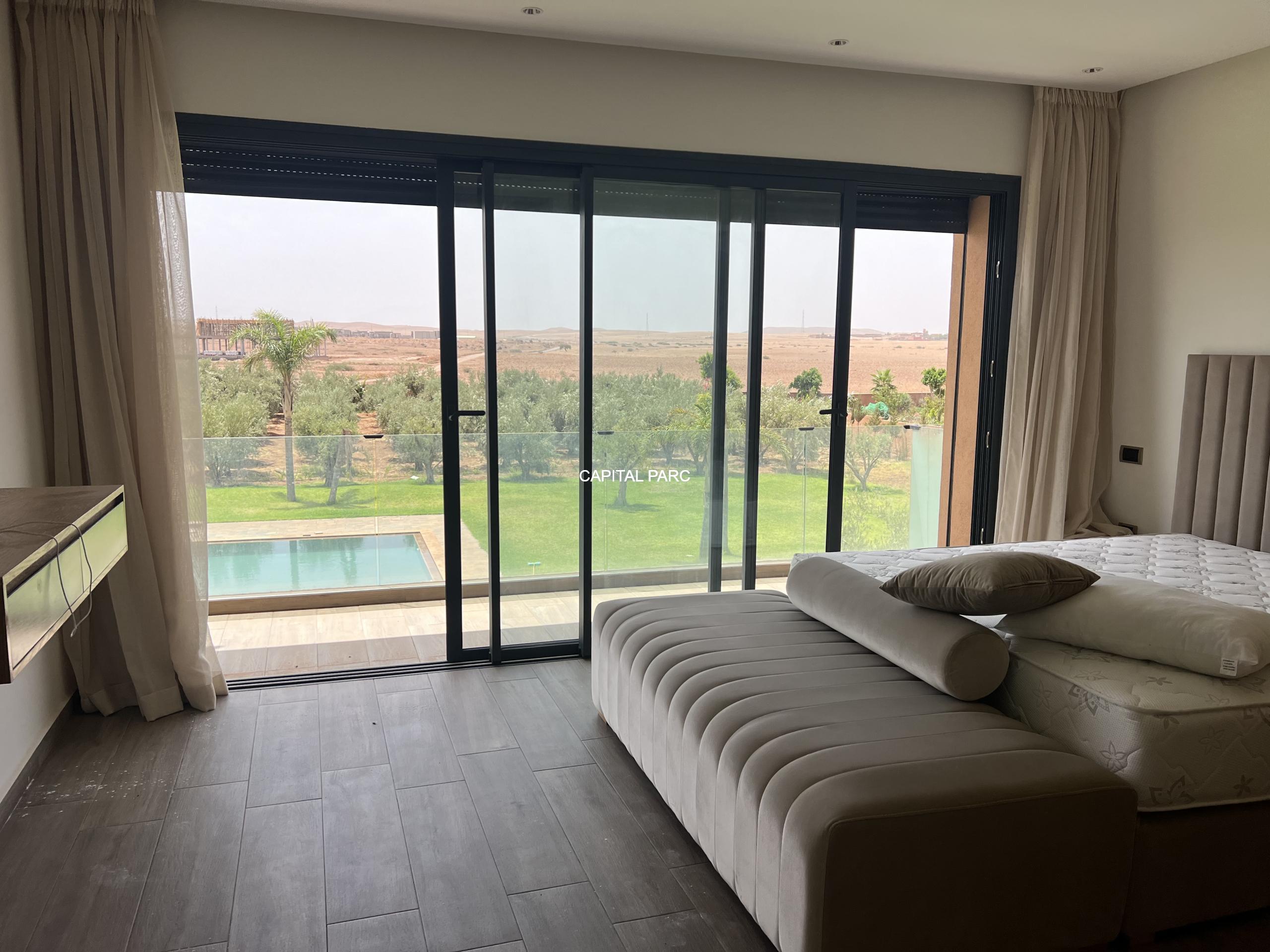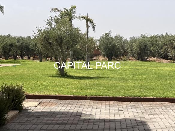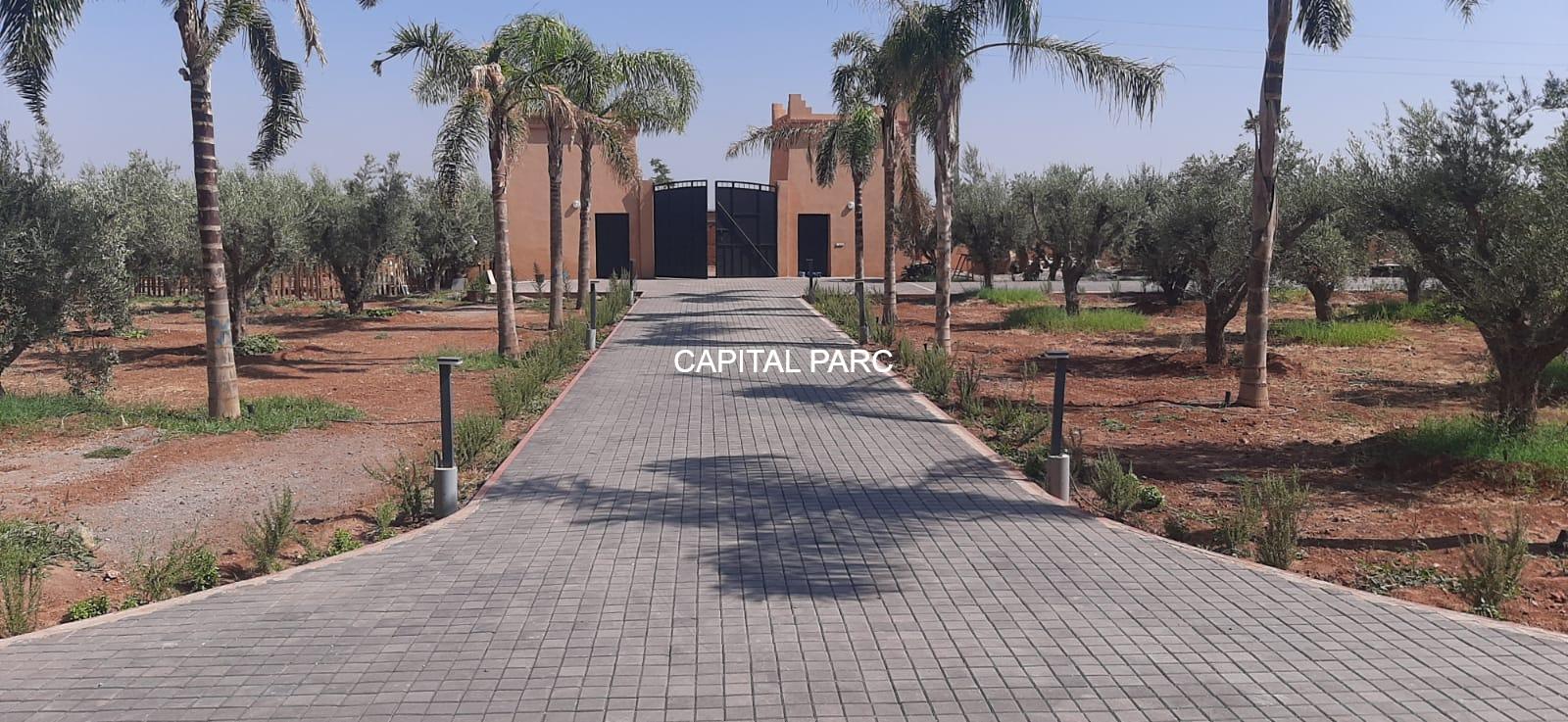 Situation : route barrage 25 minutes de marrakech , orientation : sud , superficie : 10 000 m , habitable 460 m , nombre de niveaux : 2 , nombres de suites : 6 , nombre de salon 2 , cheminée au salon , baie-vitrée partout , vue sur les montagnes, belle prestation, design art-deco , grande piscine à débordement, 17×8 m , 210 oliviers , local technique , puits , mir de clôture. Villa facilement accessible, 400 m de bonne piste . Voisinage de qualité.