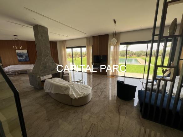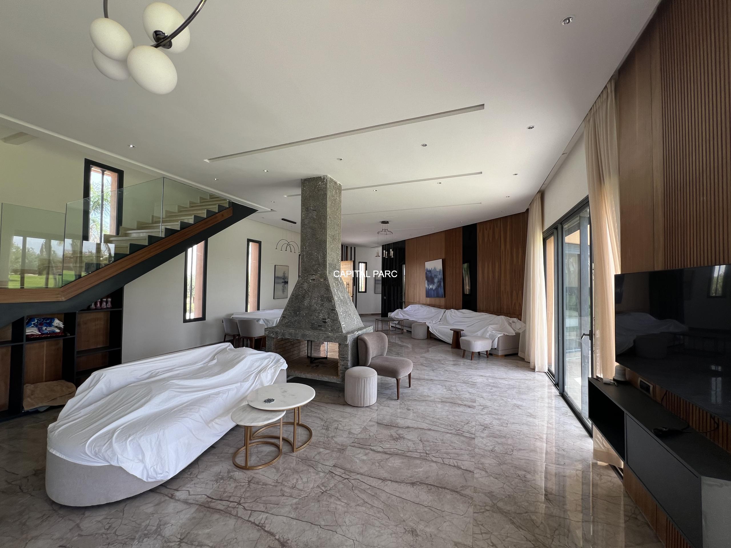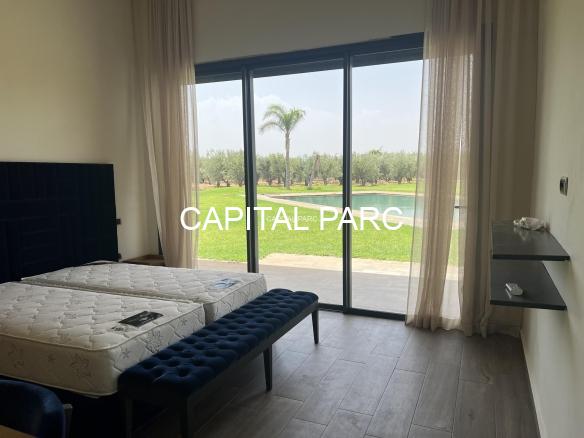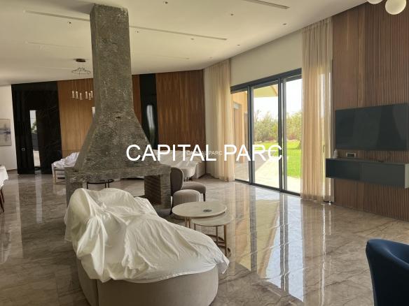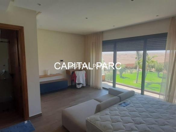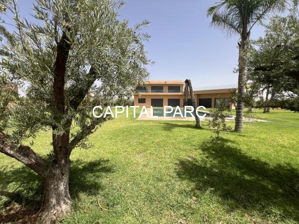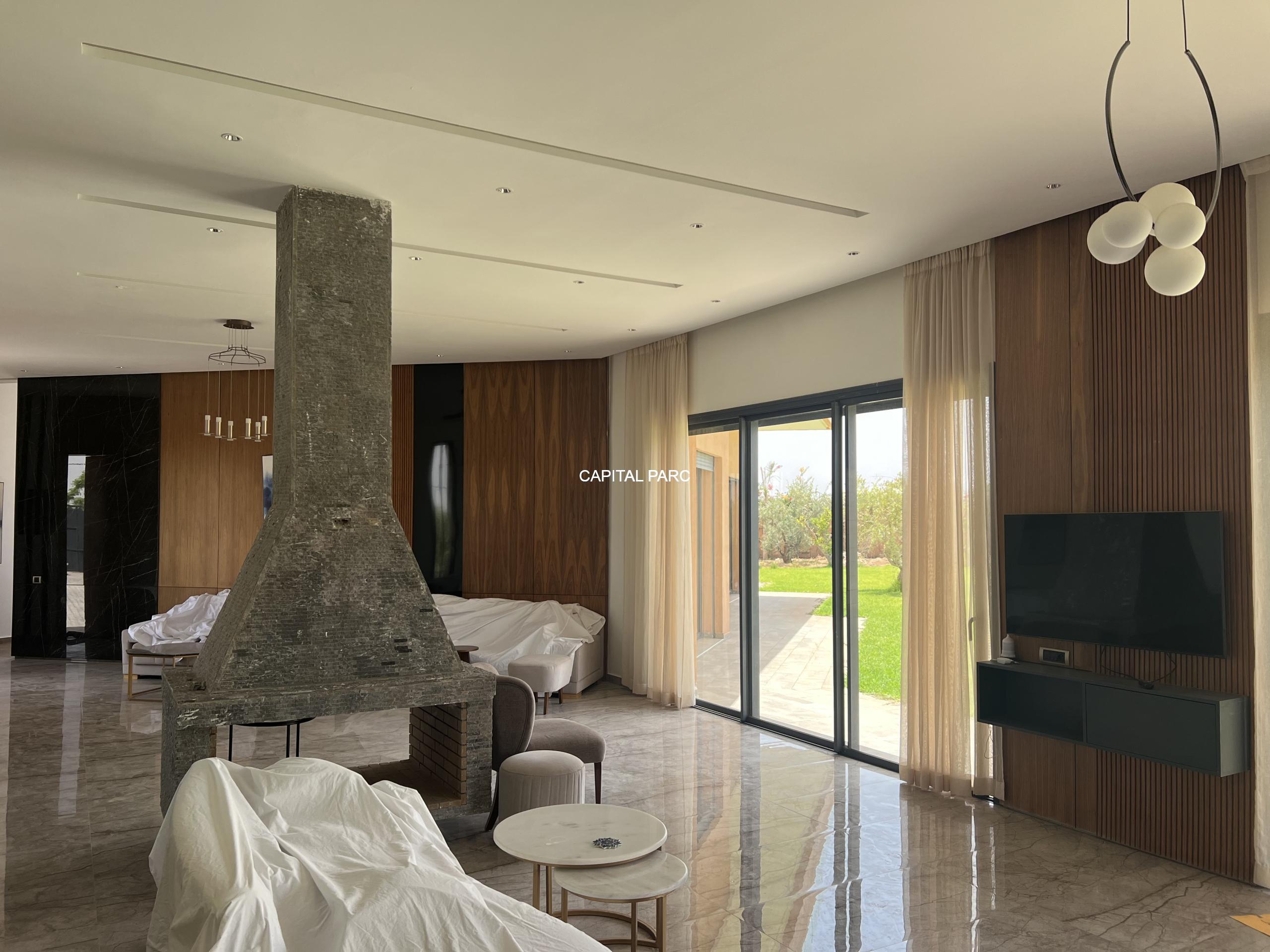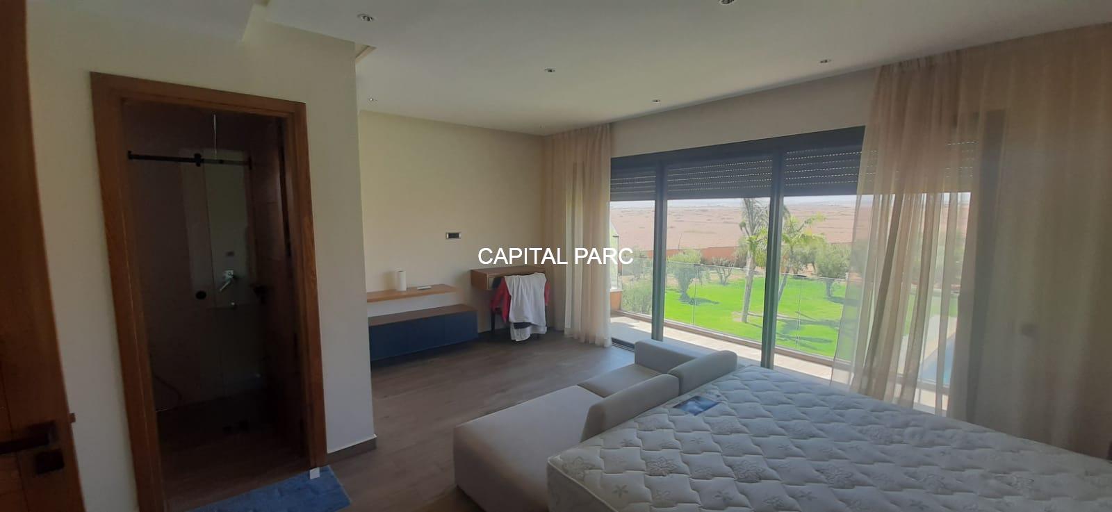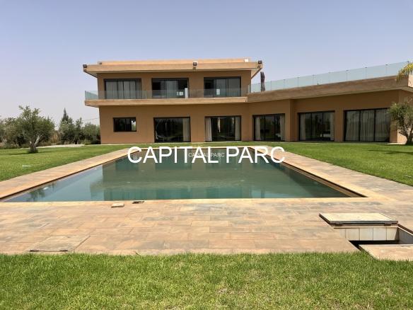 Situation : route barrage 25 minutes de marrakech , orientation : sud , superficie : 10 000 m , habitable 460 m , nombre de niveaux : 2 , nombres de suites : 6 , nombre de salon 2 , cheminée au salon , baie-vitrée partout , vue sur les montagnes, belle prestation, design art-deco , grande piscine à débordement, 17×8 m , 210 oliviers , local technique , puits , mir de clôture. Villa facilement accessible, 400 m de bonne piste . Voisinage de qualité.