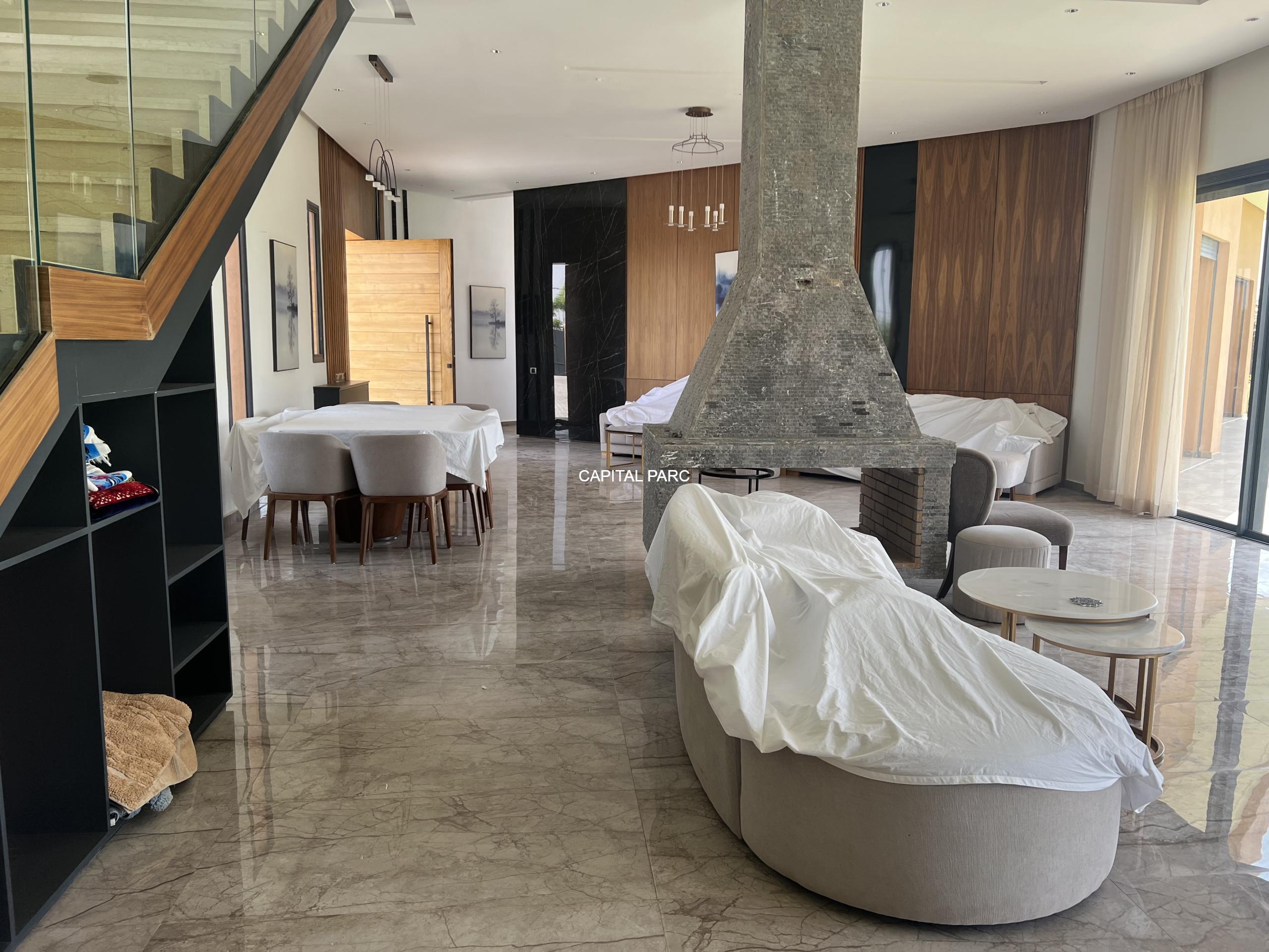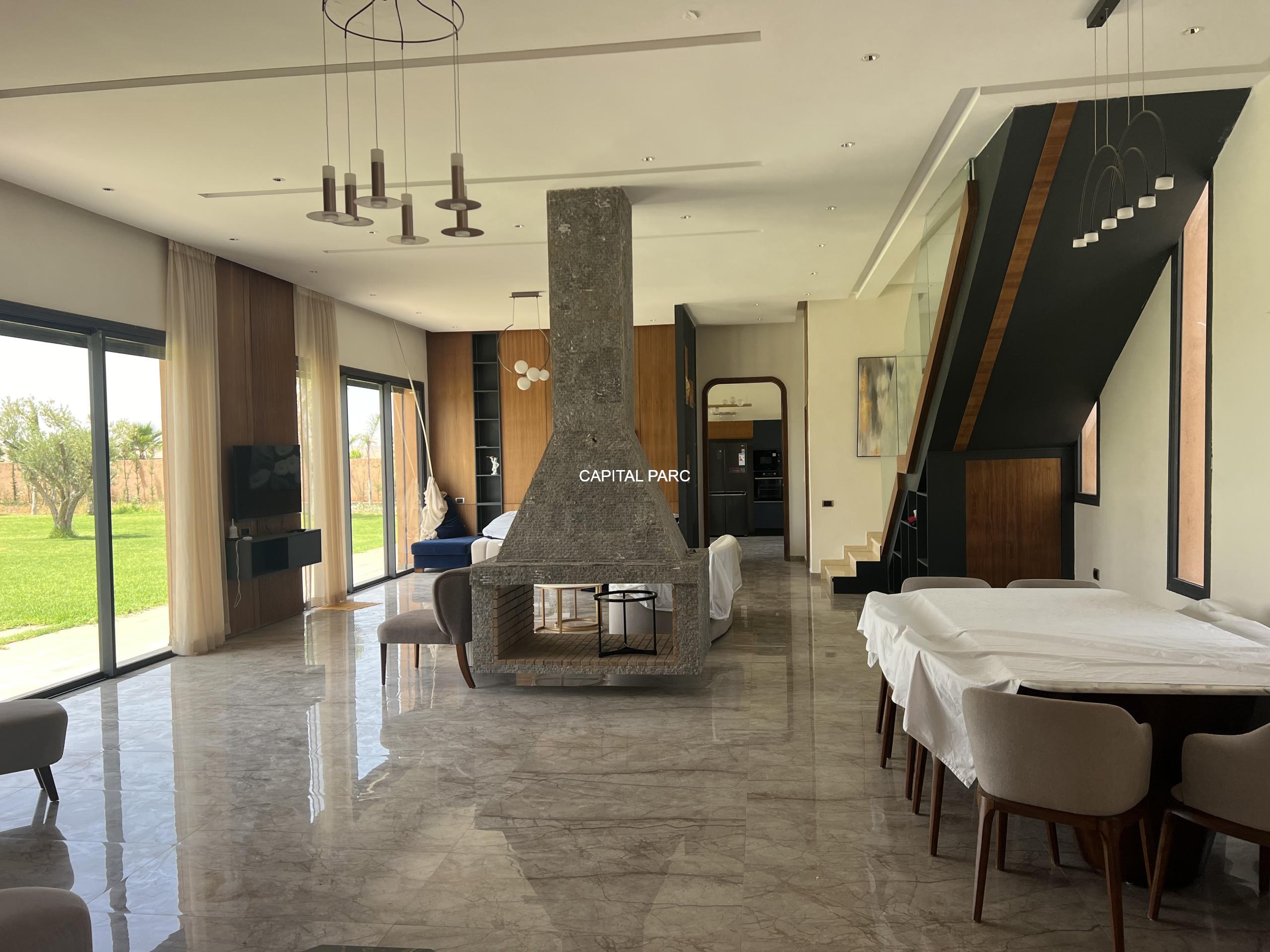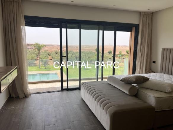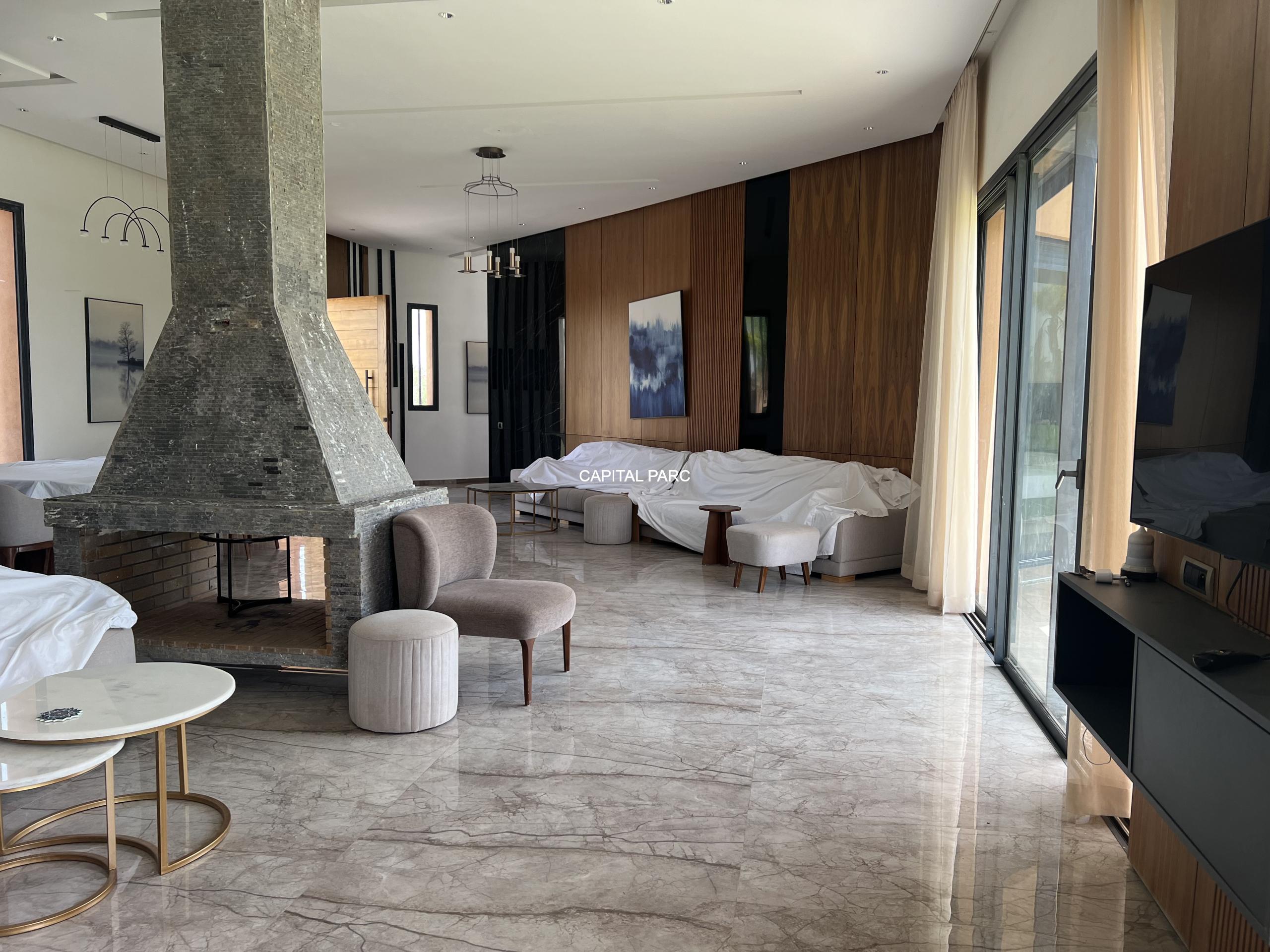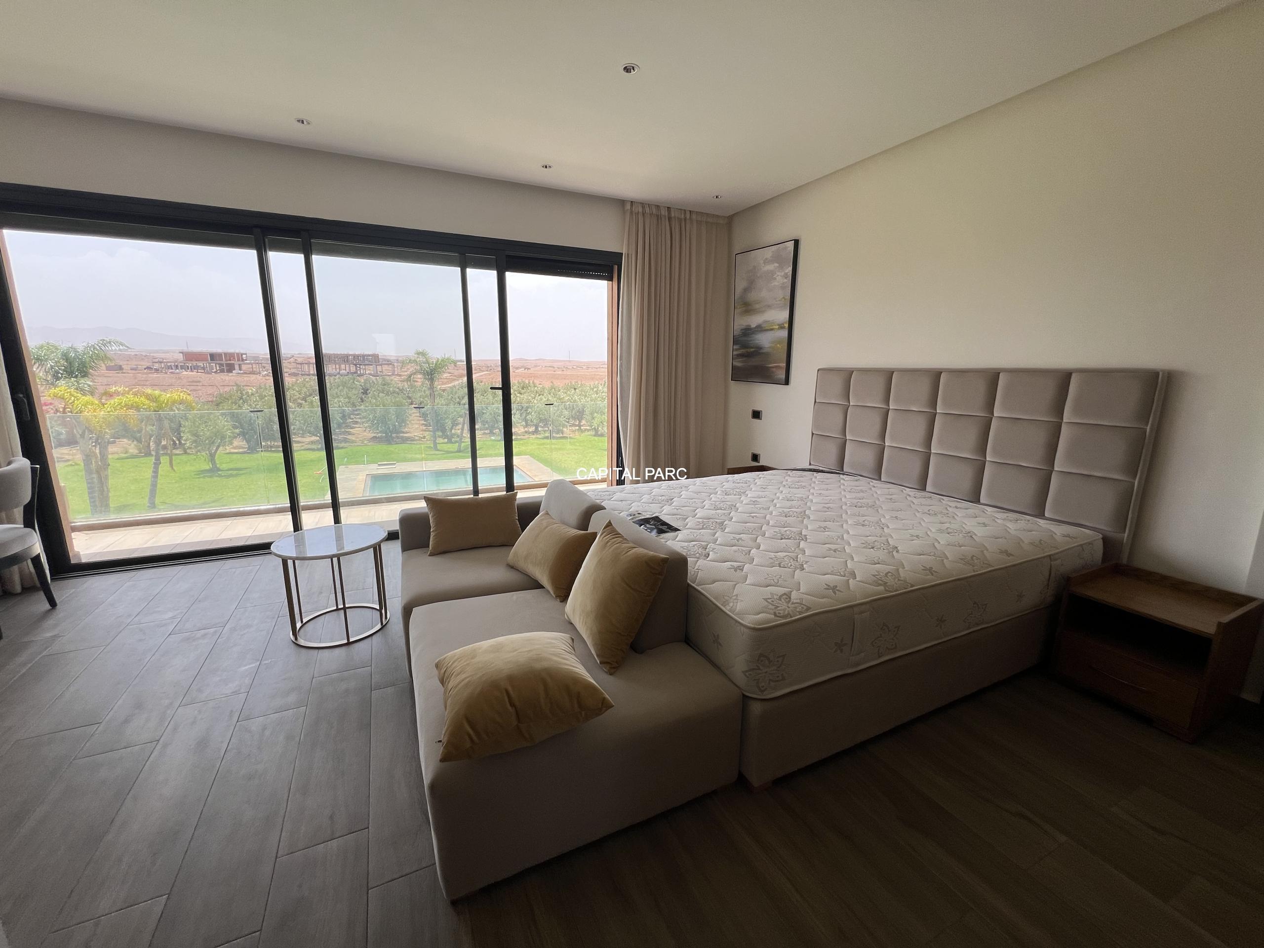 Situation : route barrage 25 minutes de marrakech , orientation : sud , superficie : 10 000 m , habitable 460 m , nombre de niveaux : 2 , nombres de suites : 6 , nombre de salon 2 , cheminée au salon , baie-vitrée partout , vue sur les montagnes, belle prestation, design art-deco , grande piscine à débordement, 17×8 m , 210 oliviers , local technique , puits , mir de clôture. Villa facilement accessible, 400 m de bonne piste . Voisinage de qualité.