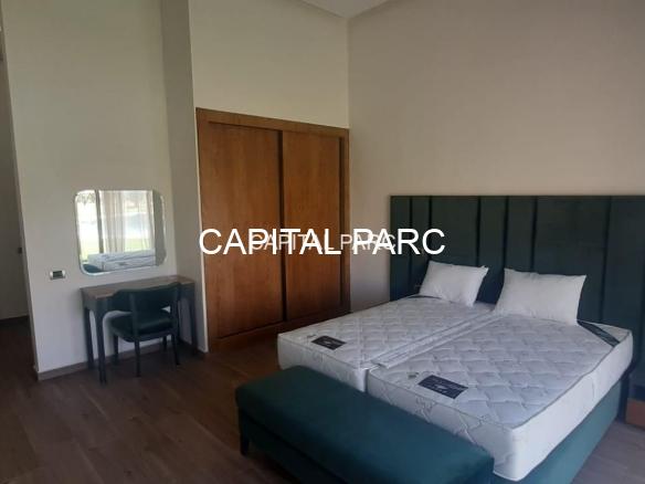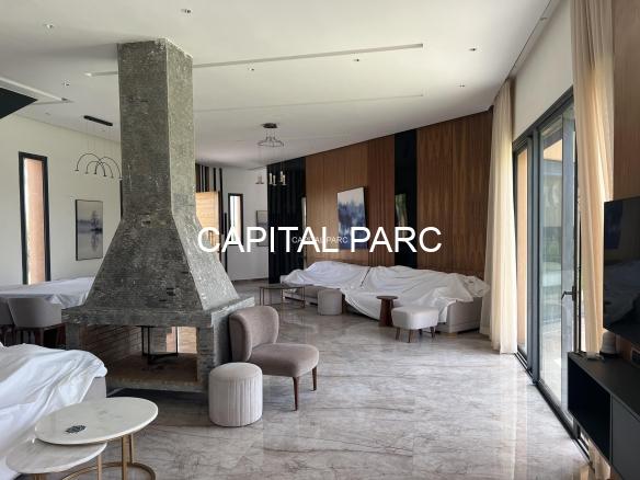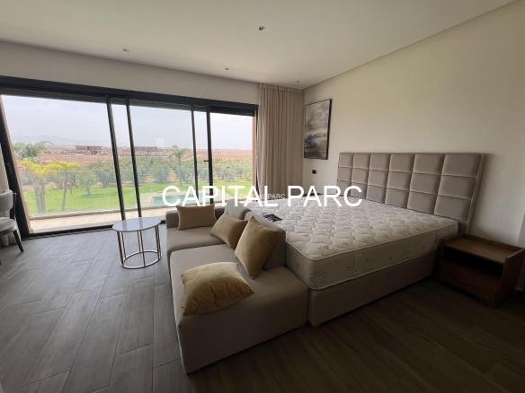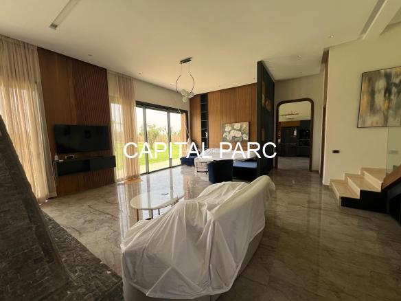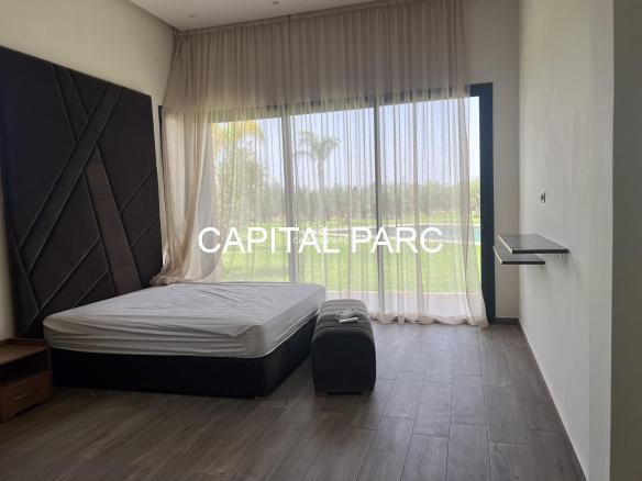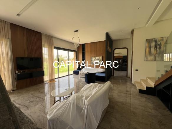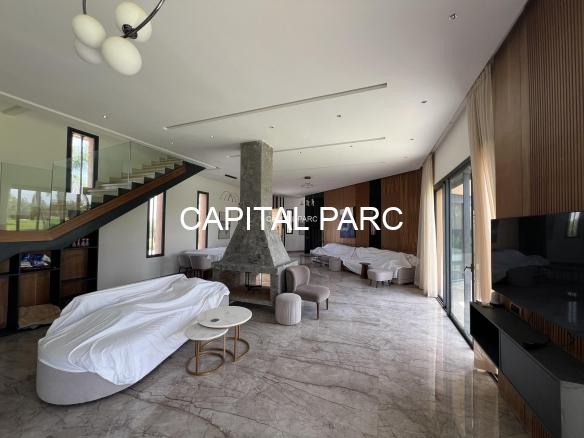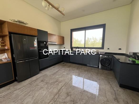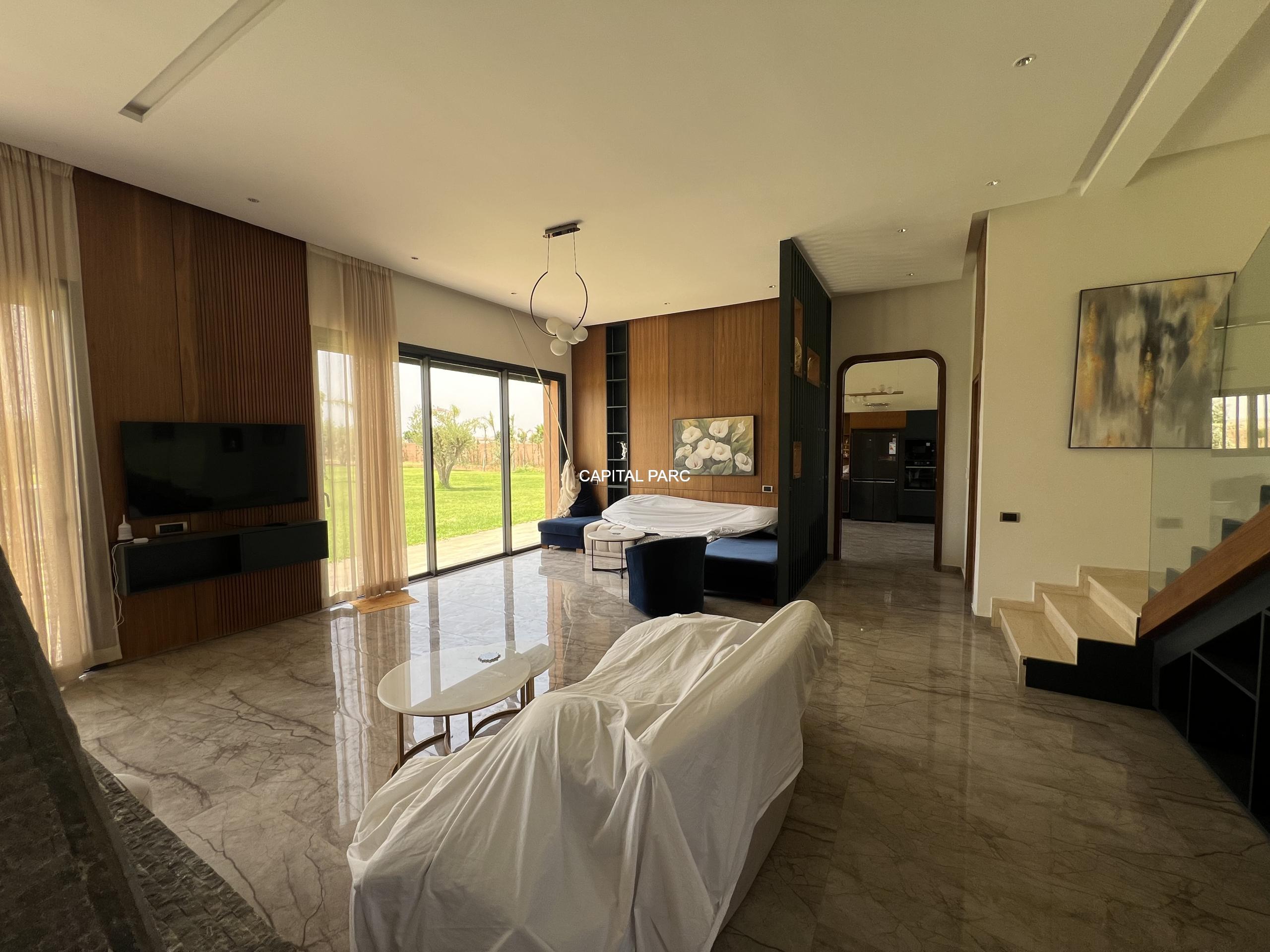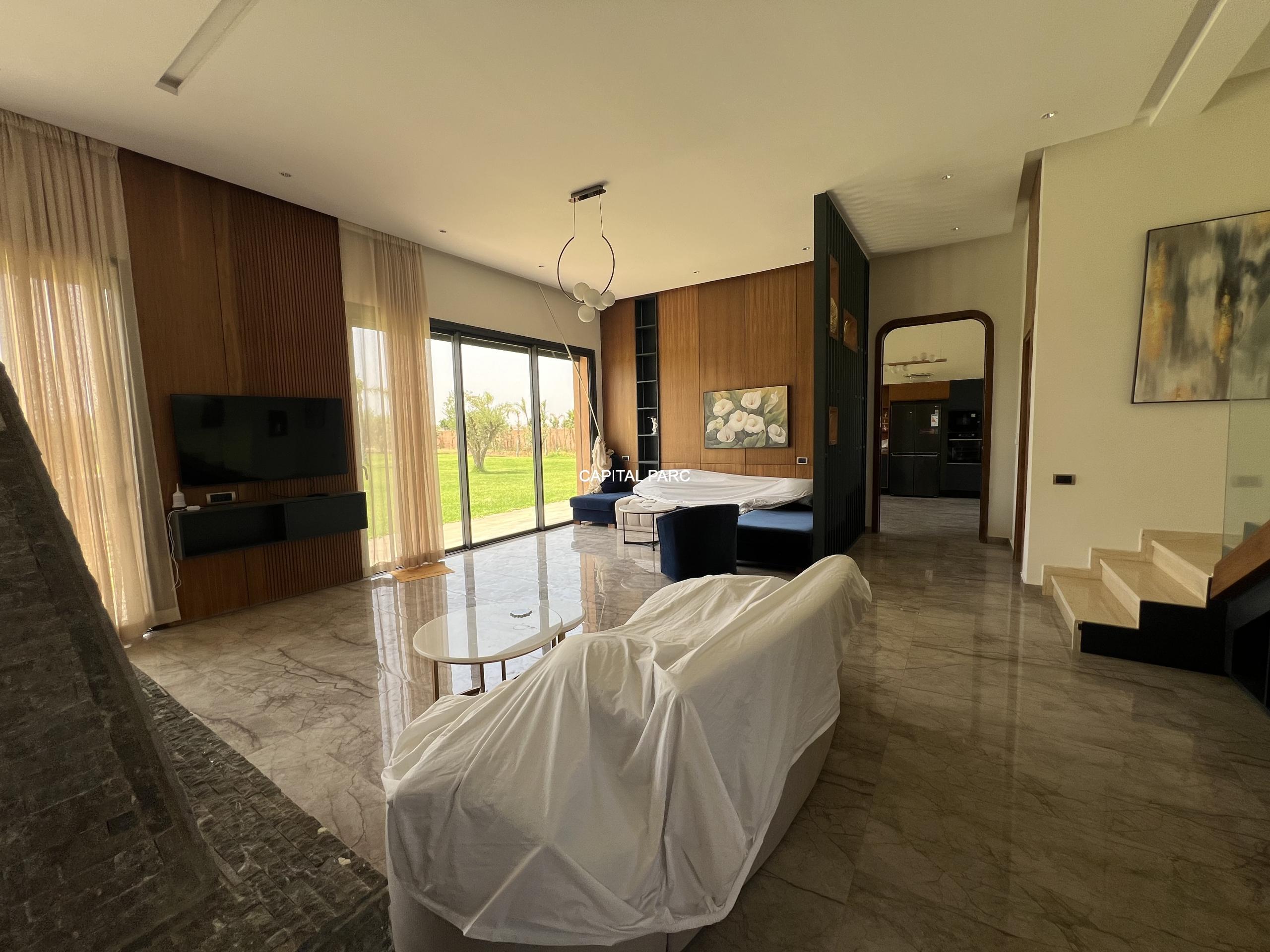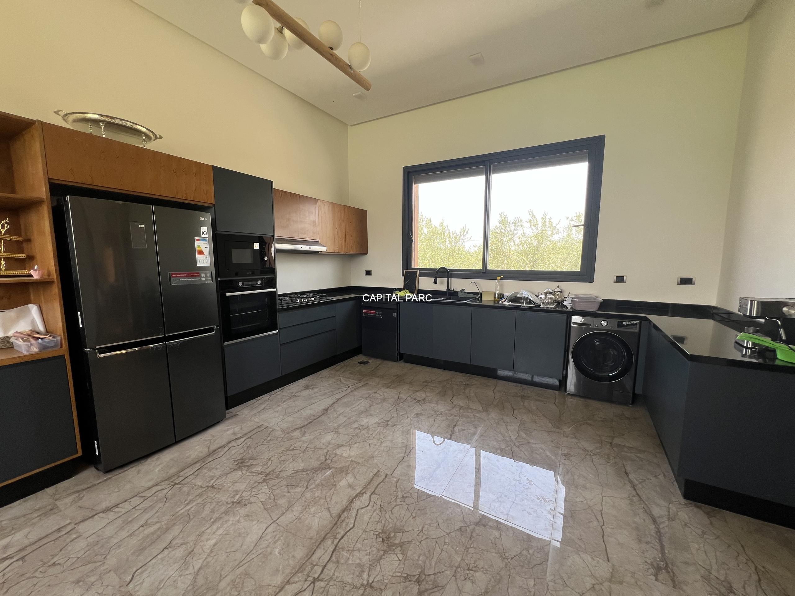 Situation : route barrage 25 minutes de marrakech , orientation : sud , superficie : 10 000 m , habitable 460 m , nombre de niveaux : 2 , nombres de suites : 6 , nombre de salon 2 , cheminée au salon , baie-vitrée partout , vue sur les montagnes, belle prestation, design art-deco , grande piscine à débordement, 17×8 m , 210 oliviers , local technique , puits , mir de clôture. Villa facilement accessible, 400 m de bonne piste . Voisinage de qualité.