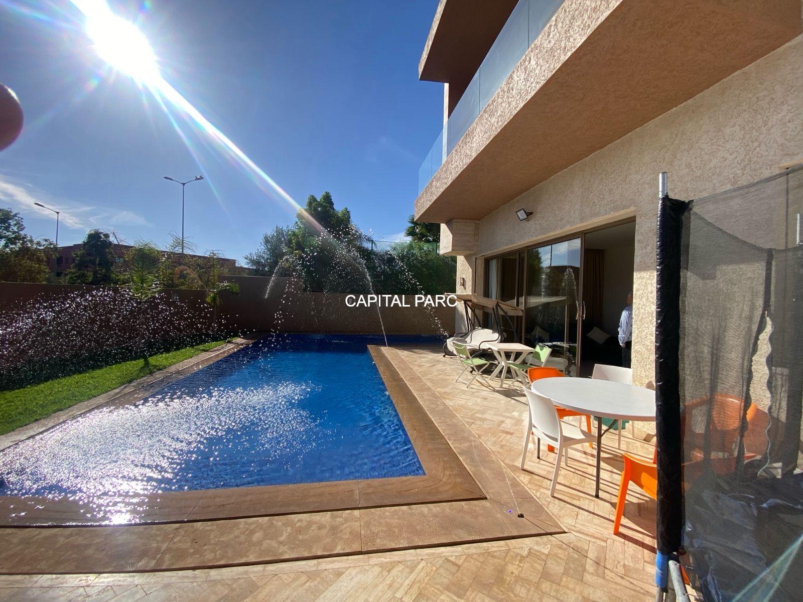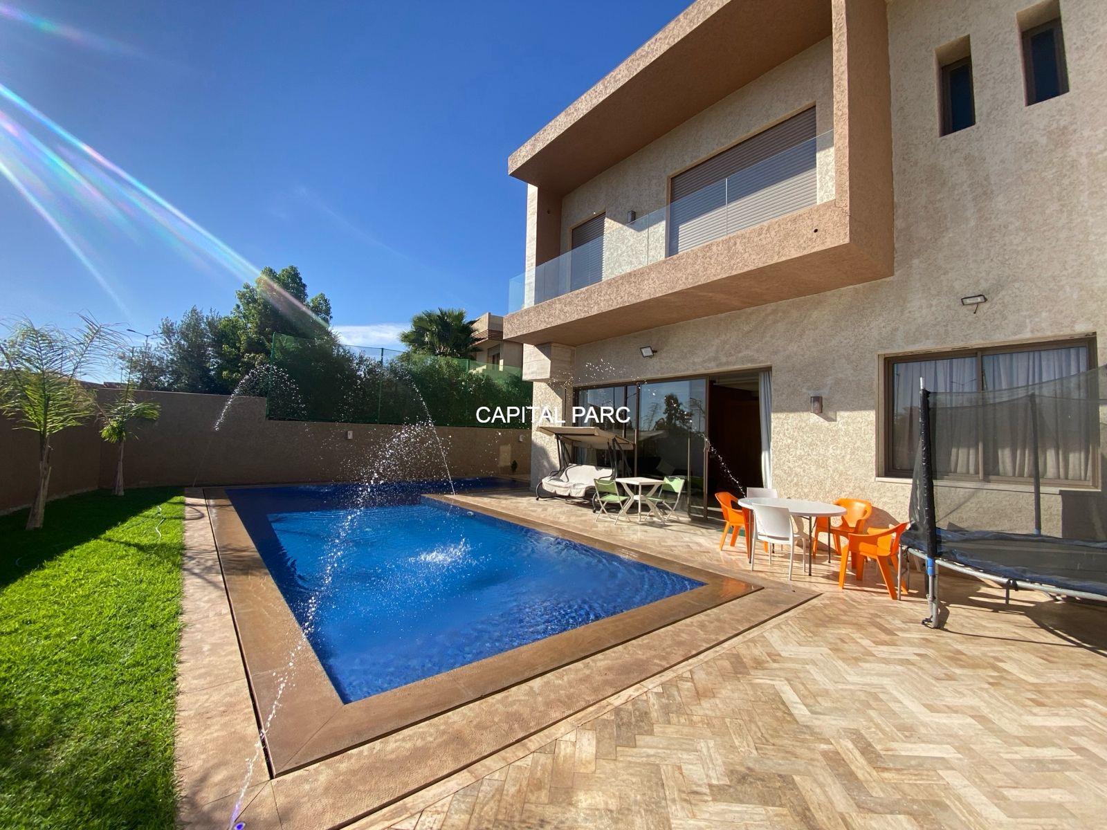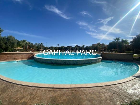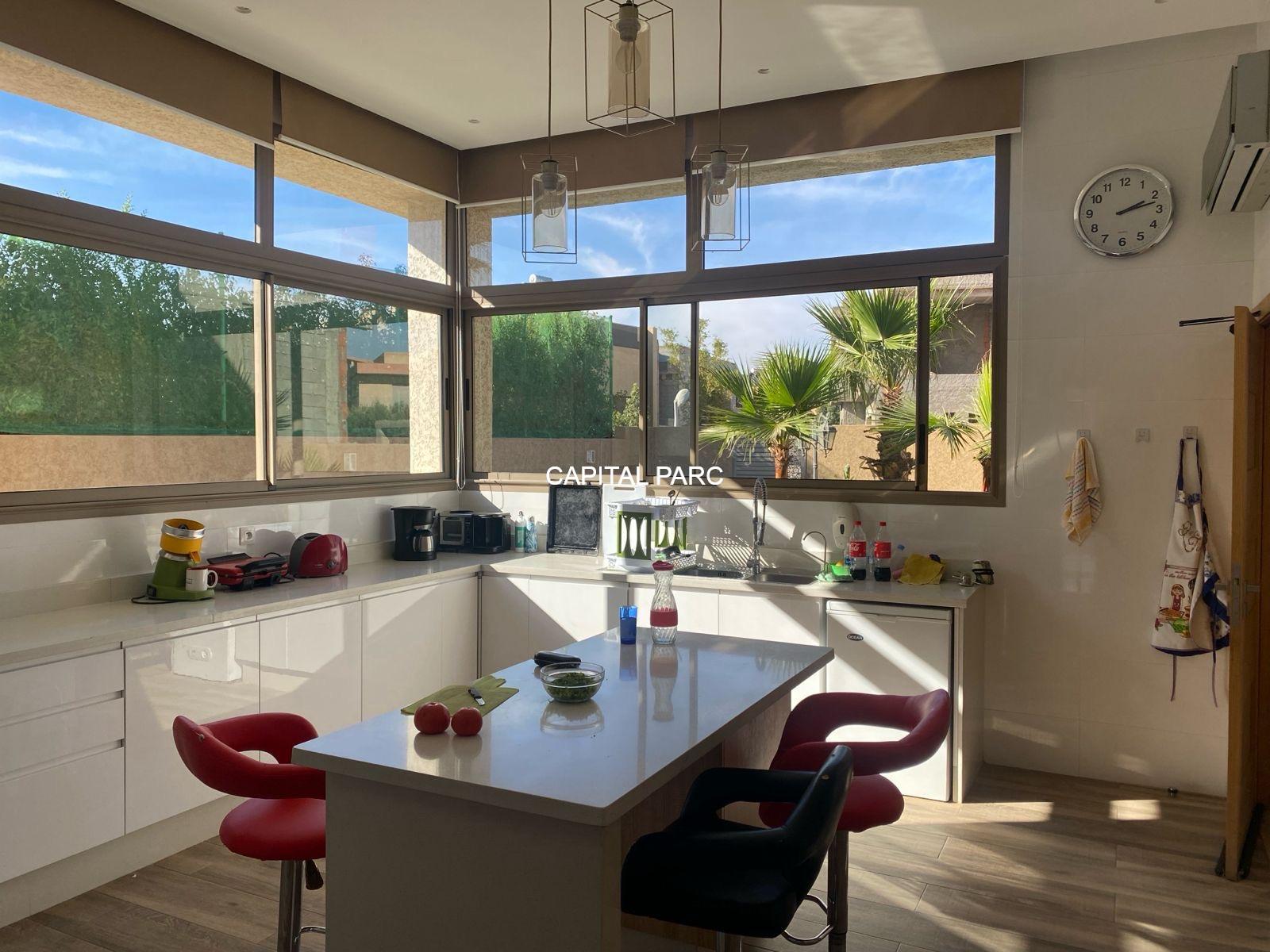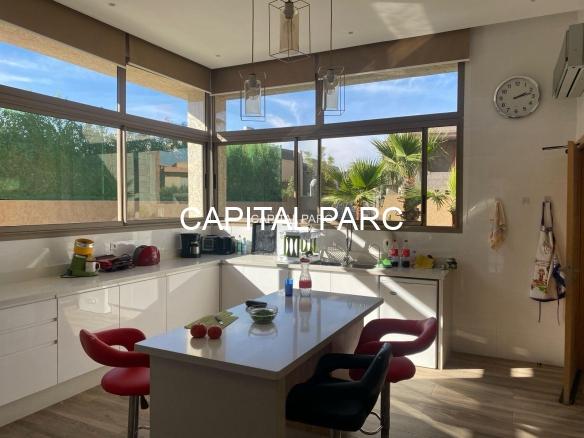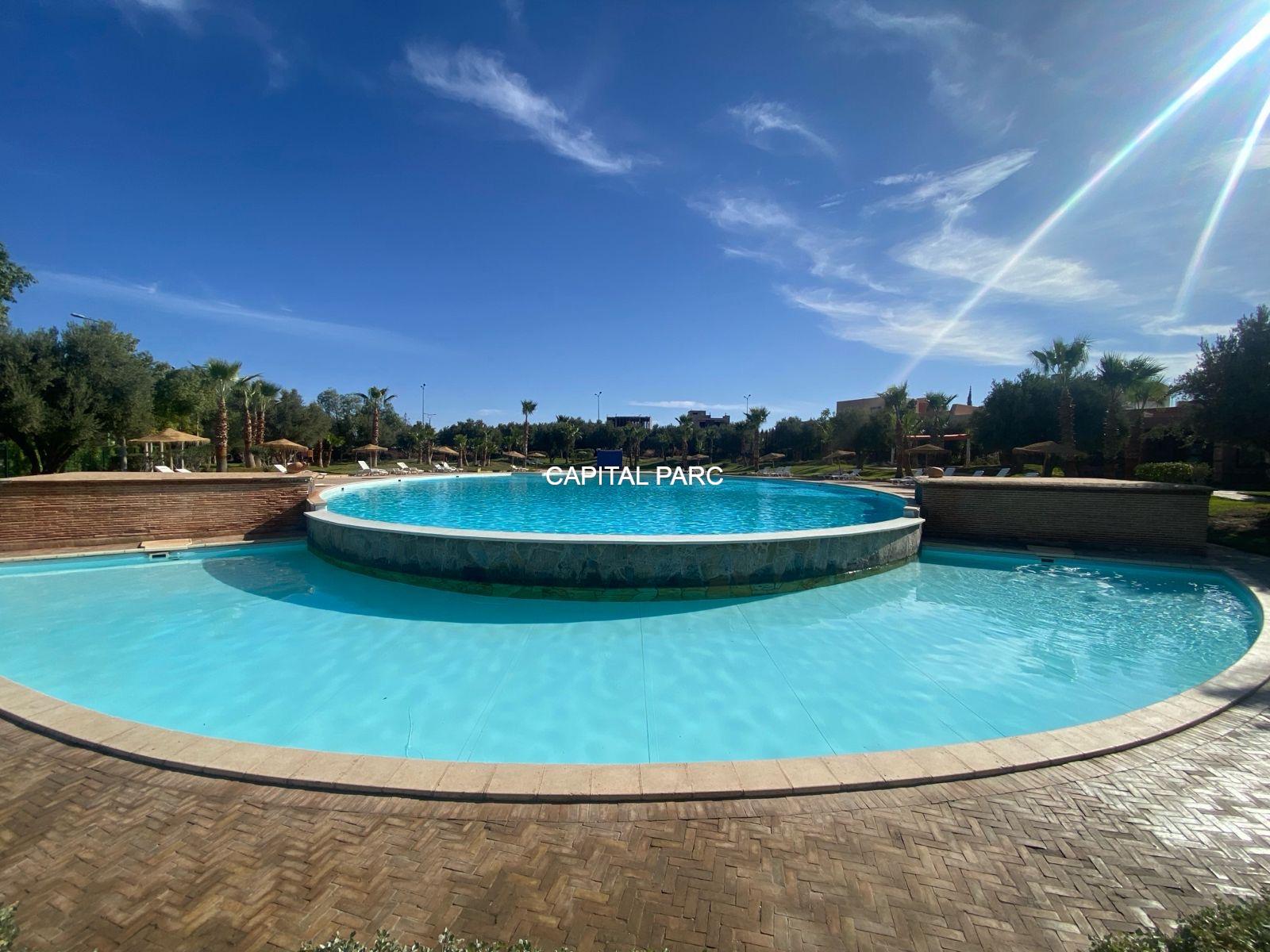 Situation : route de casablanca à 15 minutes du centre-ville de marrakech , 600 m de jardin , 05 chambres , 04 salles de bain, chambres de bonne , salon marocain , salon européen et salle à manger , grande piscine , mur en cascade d’eau , lumière tamisée, piscine moderne à débordement, cuisine avec accès services . Résidence avec poscine principale , terrain de tennis et d’autres activités à l’intérieur de la résidence.