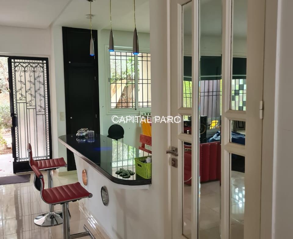 cette petite villa est située sur la route de ouarzazat à seulement 5 minutes de l’école Américaine , petite villa de 1400 m de terrain , composée d’un grand salon avec cheminée , une cuisine américaine avec une table à manger , une terrasse extérieure, 3 chambres , dont une parentale avec salle de bain et dressing , une autre salle de bain , et une terrasse sur le toit . la est dotée d’une piscine et un mini bar
